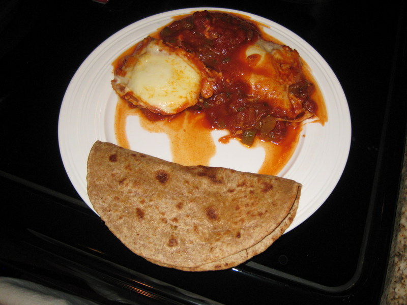 I had basically given up, and decided I had imagined the whole thing when I was looking through the cookbook my mom gave Heather before our wedding: More-With-Less. It had a recipe for huevos rancheros that matched my memories! Not only that, but my mom had even added a note next to their version saying that it was one of my favorites growing up!