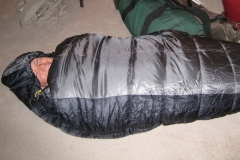 A sleeping bag rated down to ZERO degrees! The picture isn’t from the camping trip, but Heather thought she should record my testing the bag for proper fit.