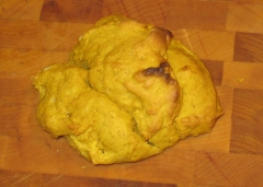 Initially I thought I could try adding some more flour, but then I worried that the biscuit-ness of the resulting paste might not be there anymore. Looking at what I had in the bowl a little more, I decided it was thick enough I could probably just scoop it onto the baking stone and see what happened.